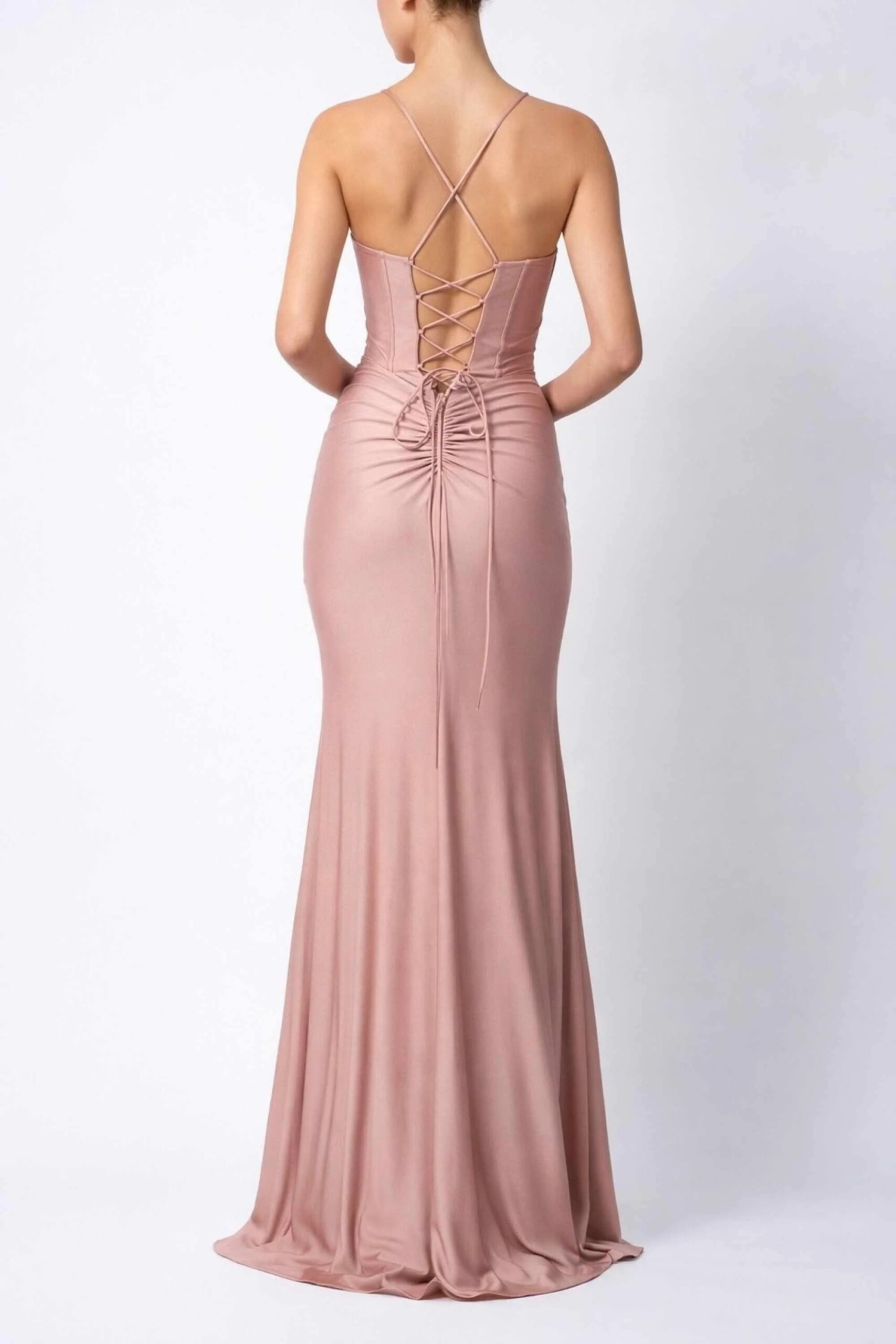 The cross-pleated bodice gently defines the waist, creating a sculpted and flattering silhouette without feeling restrictive. Slim spaghetti straps and a soft V-neckline frame the décolletage beautifully, adding a delicate and feminine touch. Made from smooth jersey fabric, the dress drapes effortlessly over the body, flowing into a graceful floor-length hem that elongates the silhouette.